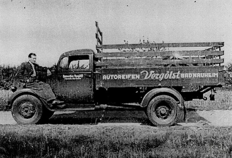 Der erste Vergölst-LKW, ein OPEL Blitz. An der Aufschrift Bad Nauheim, wohin Vergölst nach dem 2. Weltkrieg umzog, kann man sehen, dass es die Zeit in den 50ern sein müsste. Bad Nauheim und Vergölst hat evtl auch mit einem anderen prominenten Bewohner der Stadt zu tun: Elvis Presley. Ob sein 507er BMW auch mal in der Nauheimer Werkstatt war? Wer Fotos aus der Zeit hat, bitte melden. Foto: Vergoelst.de