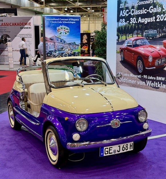 Auf dem Stand von "Classic Gala Schwetzingen" beeindruckt ein Fiat 500 Jolly, Bj. 1968, mit zweifarbiger Lackierung. 2-Zyl. luftgekühlt, 499 ccm und 18 PS. Foto: C. Marciniak